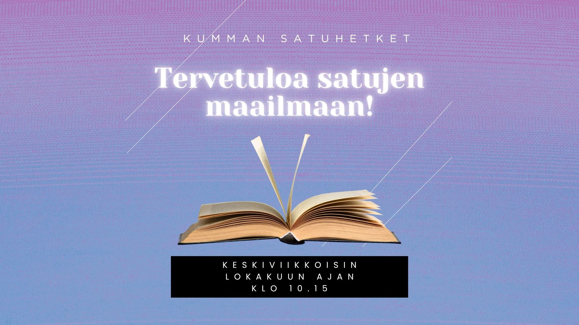 Tervetuloa kuuntelemaan satuja KUMMAan lokakuun ajan. Satuhetkiä kuullaan joka keskiviikko 8.10. alkaen klo 10.15. Satuhetket tarjoavat noin puolen tunnin ajan lapsille, ja miksi ei aikuisillekin, täydellisen mahdollisuuden uppoutua tarinoiden maailmaan, rentoutua ja päästää mielikuvitus lentämään.